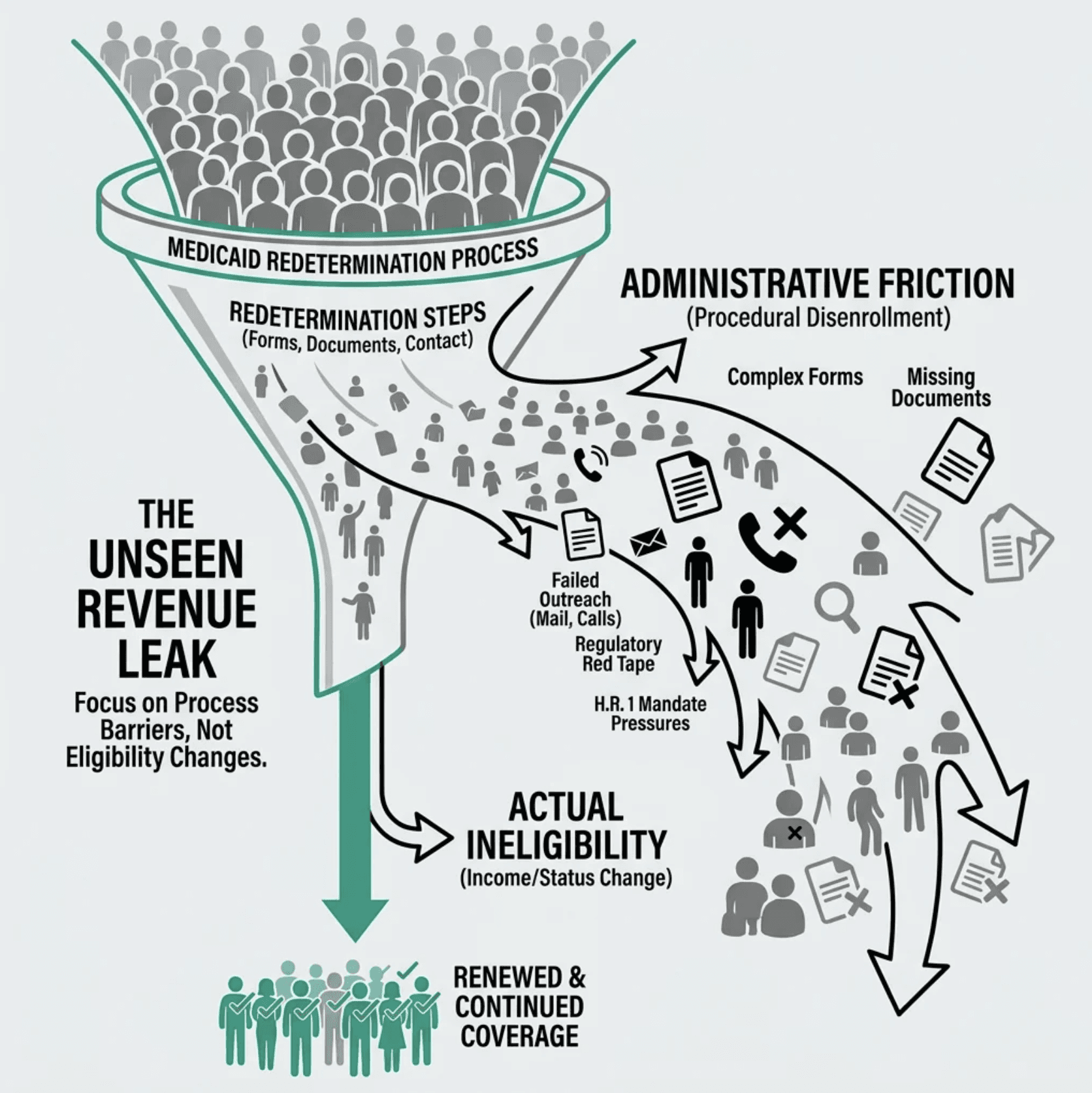 Implement proven PMPM revenue preservation strategies by reducing Medicaid administrative churn with automated, multi-modal outreach for Medicaid redeterminations under the H.R. 1 mandate
